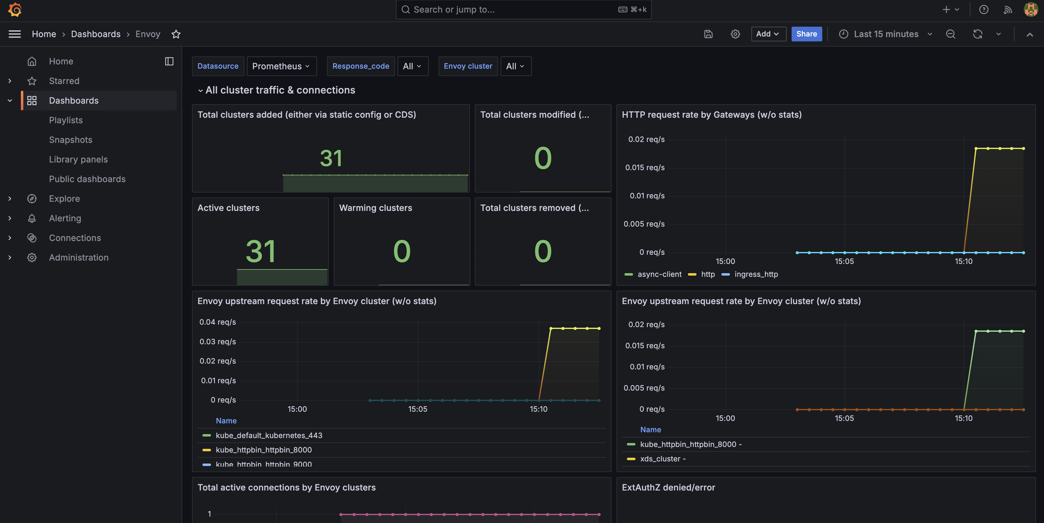 Go to Dashboards > Envoy to open the Envoy dashboard that you imported. Verify that you see Envoy-specific data, such as the number of clusters, request rates, or active connections. You can also see metrics for the traffic that you generated for the httpbin app.